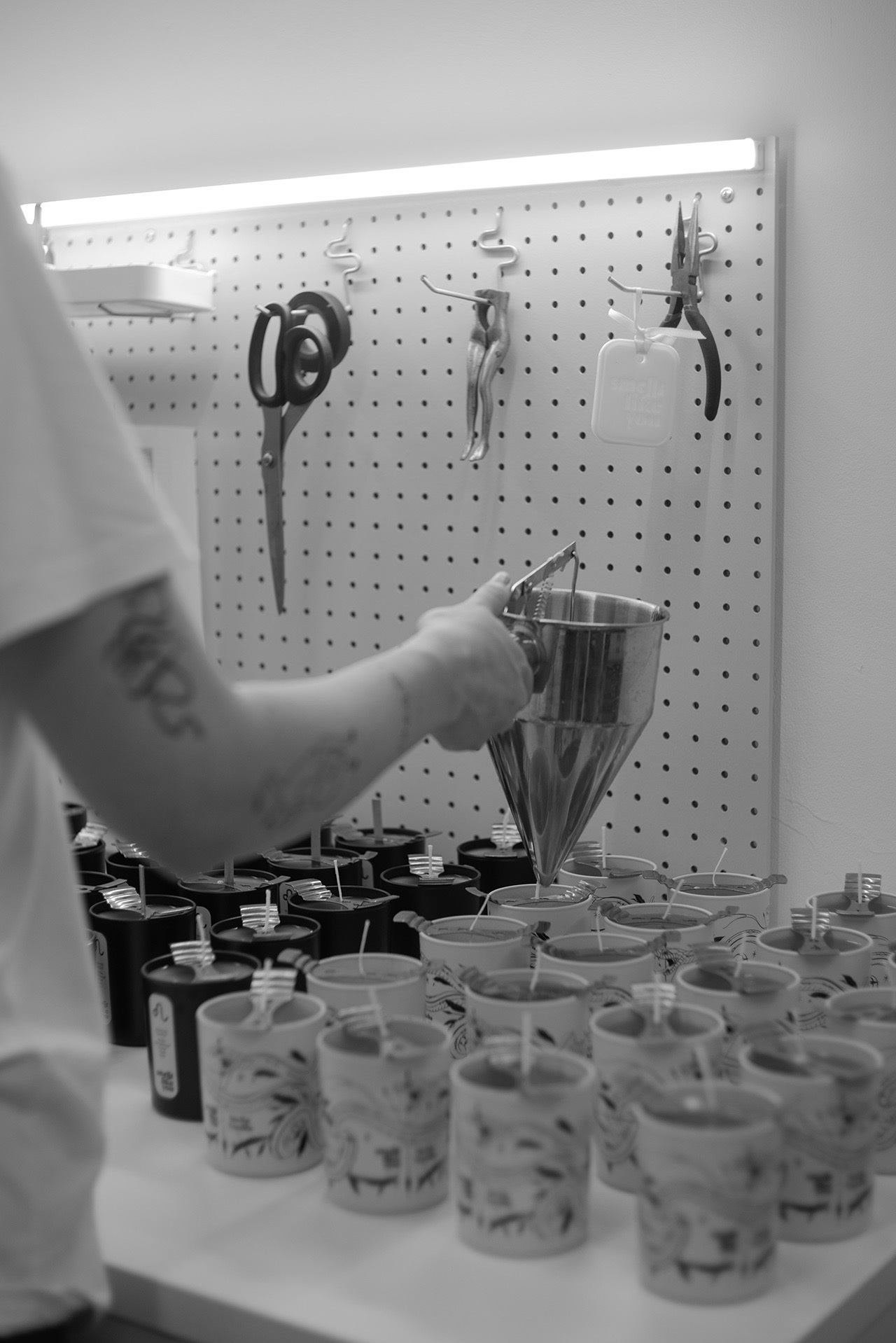 Несколько месяцев мы в Москве собирали основу аромата, а Саша в Краснодаре работала над эскизами для будущей свечи. Летом мы встретились, чтобы закончить работу над ароматом, которому дали название Wood Tattoo.