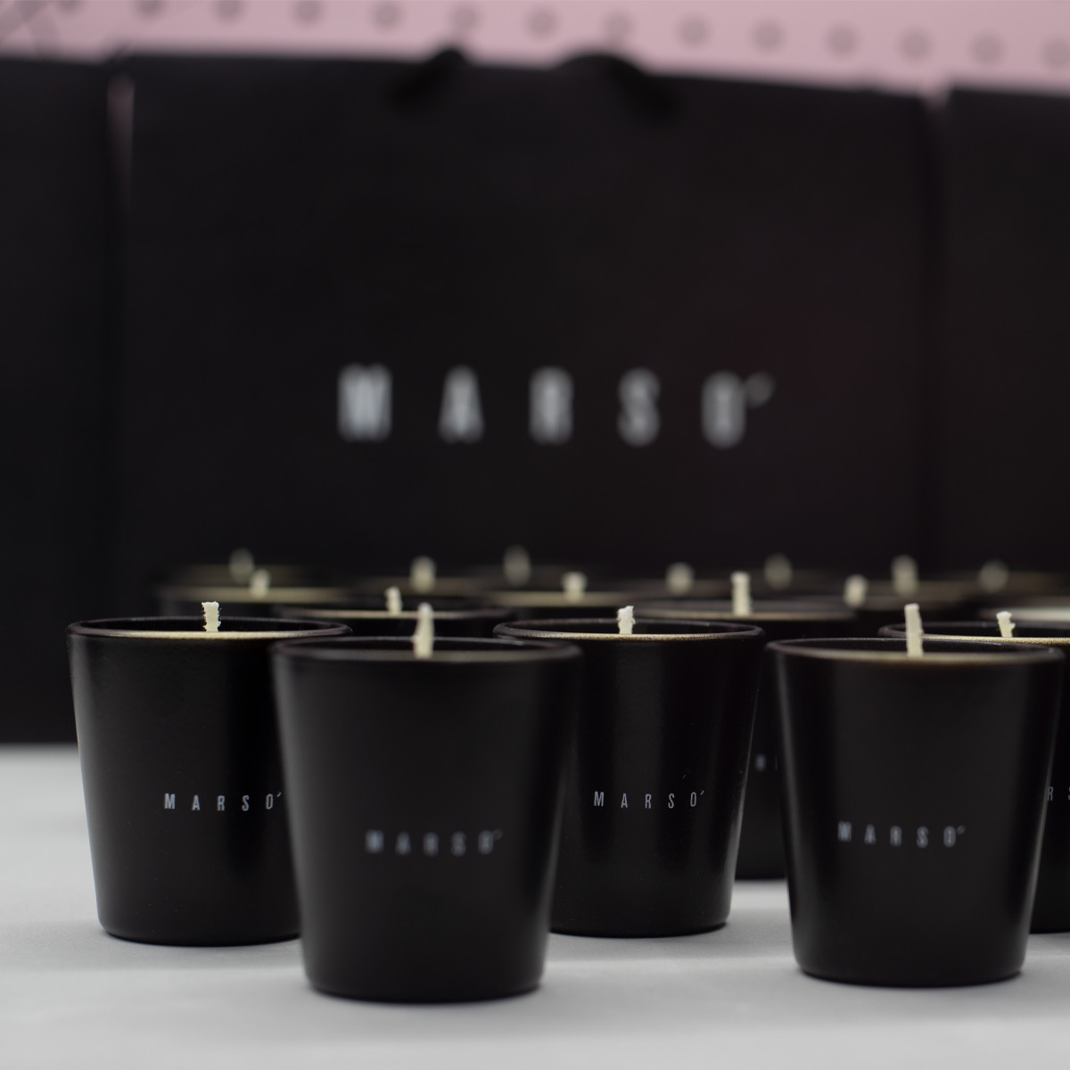 Минисвечи из подарочного набора для архитектурного бюро "MARSO". Подарочный бокс с ароматическими свечами в большом и малом размере и аромадиффузором с палочками.
